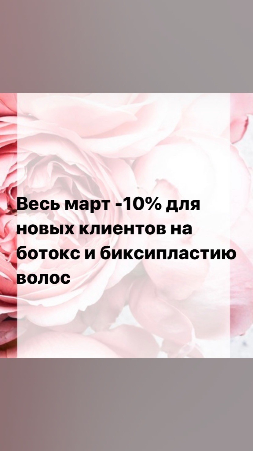 Полировка волос 500₽ любая длина (подравнивание кончиков машинкой входит в стоимость)Ботокс волос: до плеч-1300₽🌸до подмышек-1600₽🌸ниже лопаток-2100₽🌸до середины спины-2600₽до пояса-3100₽🌸ниже пояса-3600₽. Биксипластия от 1500₽; (Полировка при процедурах200₽); Нанопластика Floractive. Работаю в студии. Опыт работы более 3 лет.
